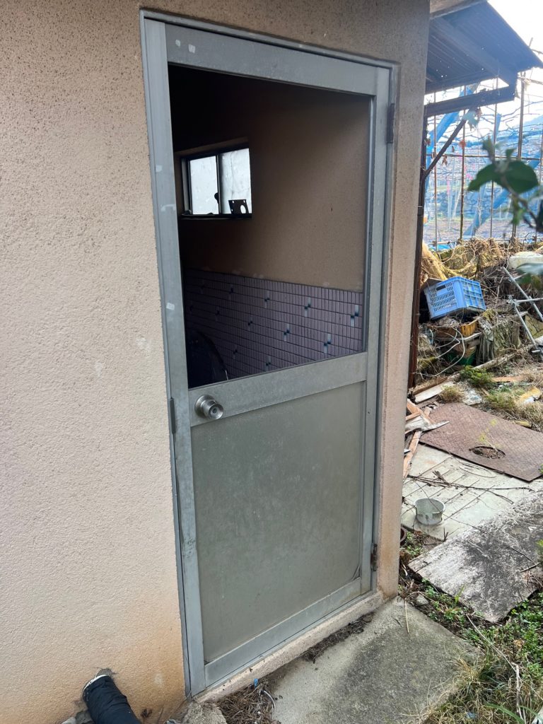 今回は屋外トイレの入口ドアの上部をガラスからパネルに入替えました。