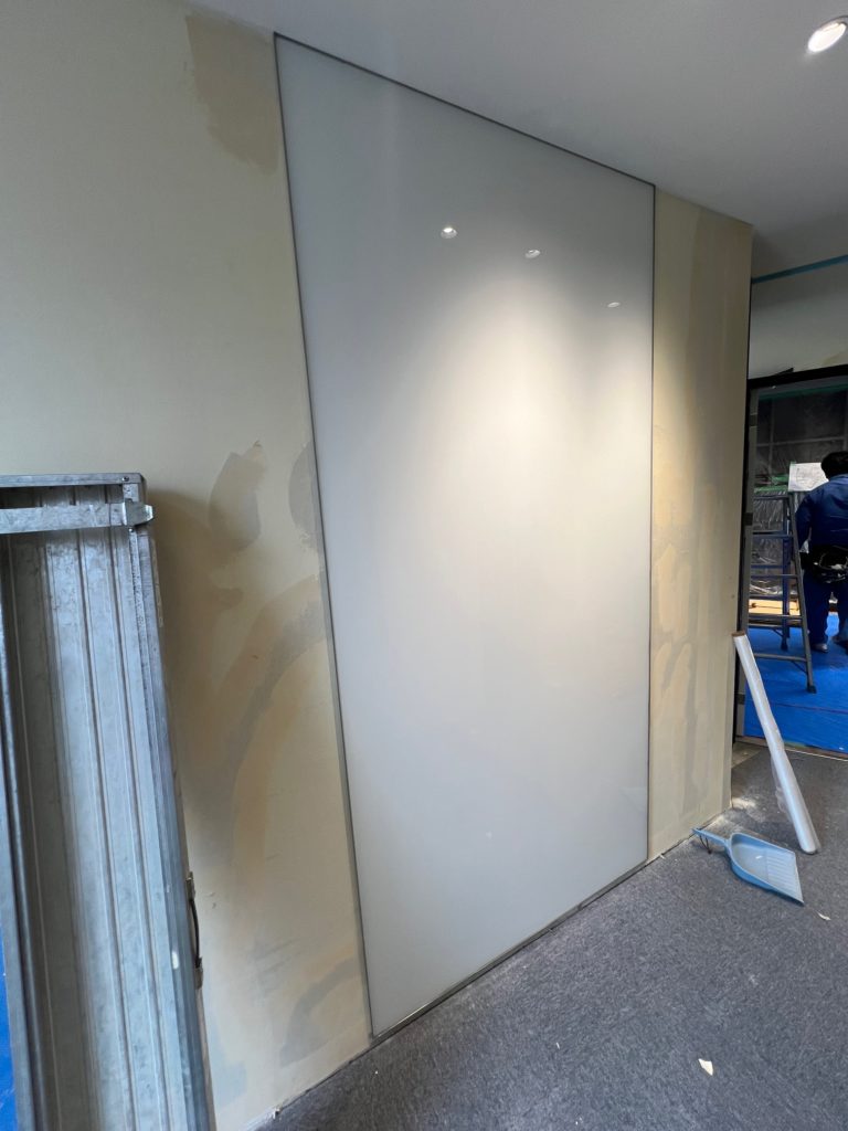 今回のカラーガラスはビルに入られるお客さんの会社のサインを取付けるためのガラスになります。
